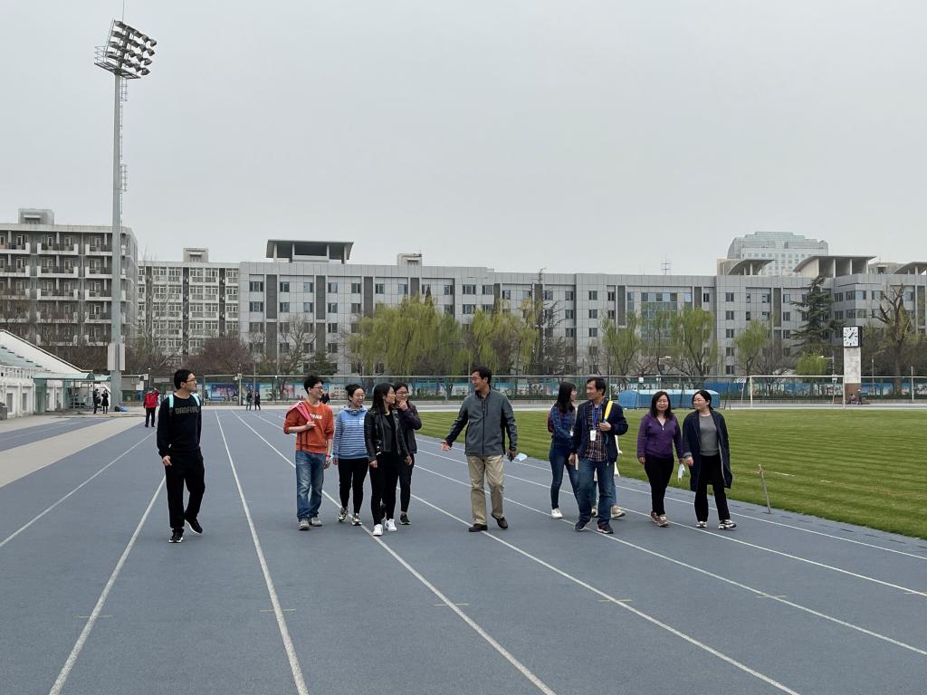 学院教师精神饱满,沿体育场跑道行进5公里,一路上聆听院领导讲解党史故事和新中国发展史,交流教学科研经验和摄影构图技巧,欢声笑语不断。