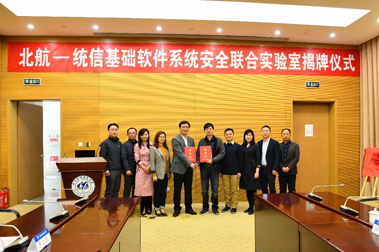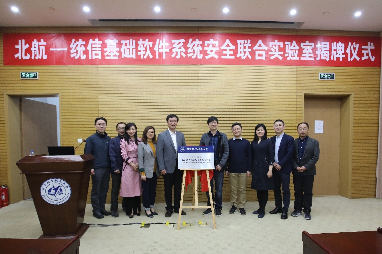 4月12日上午,pg游戏电子模拟器(简称:北航pg游戏电子模拟器)与统信软件技术有限公司(简称:统信软件)共建“北航—统信基础软件系统安全联合实验室”揭牌仪式在pg游戏电子模拟器成功举行。北航pg游戏电子模拟器院长刘建伟、党委书记蒋燕玲、副书记祝贺、副院长伍前红、副院长白琳、统信软件总经理刘闻欢、高级副总经理张磊、副总经理许可、副总经理令狐永兴、人力资源总经理武红伟等领导出席并见证本次揭牌仪式。