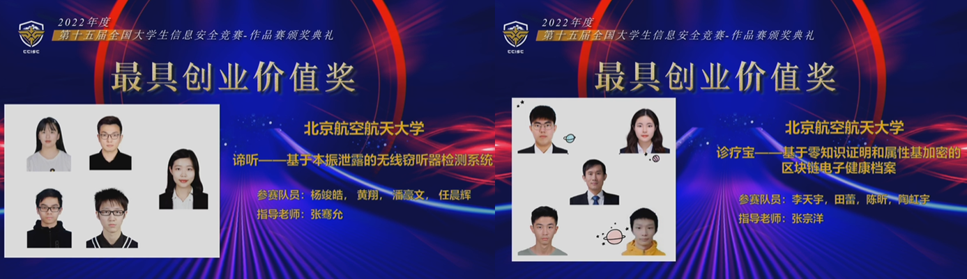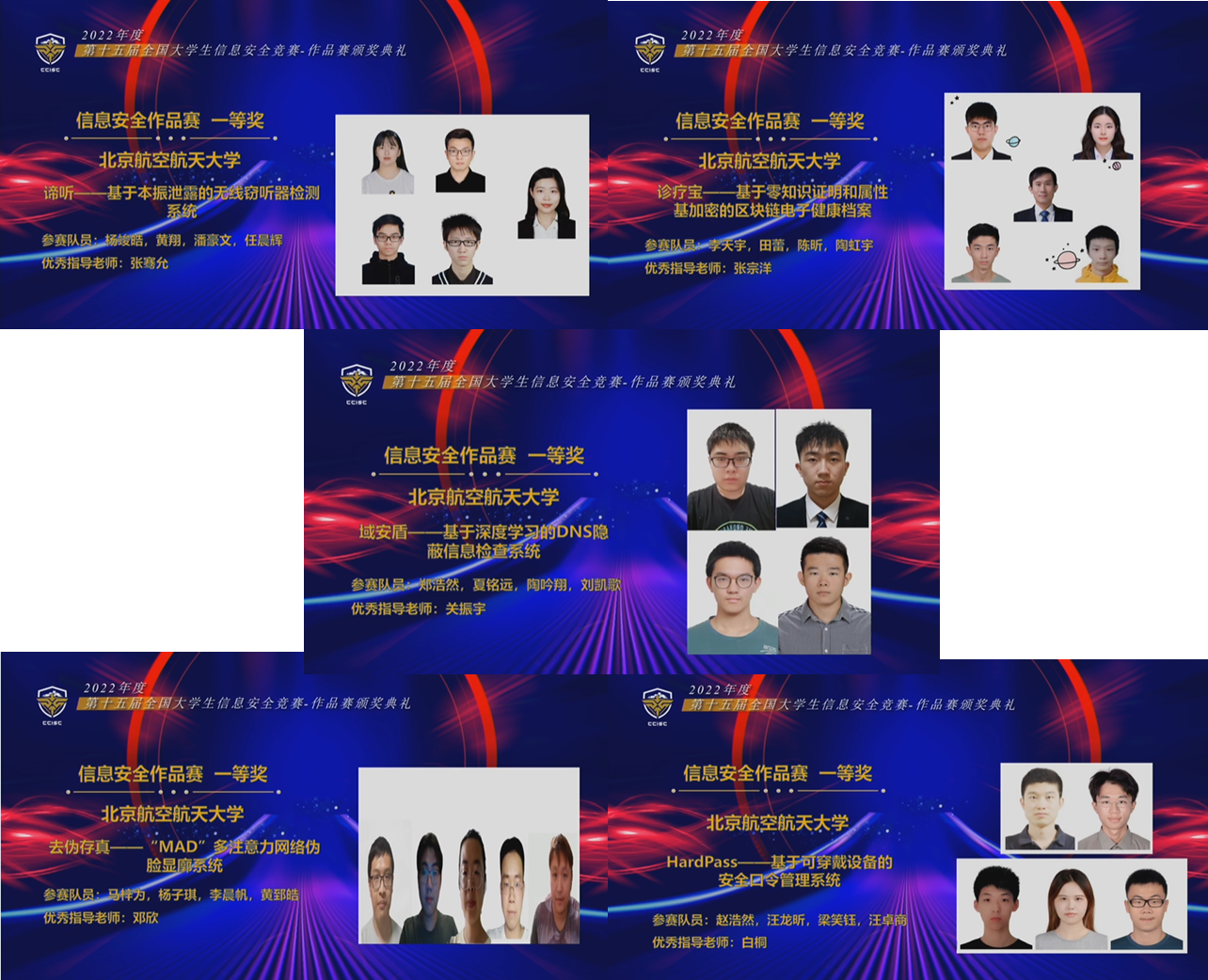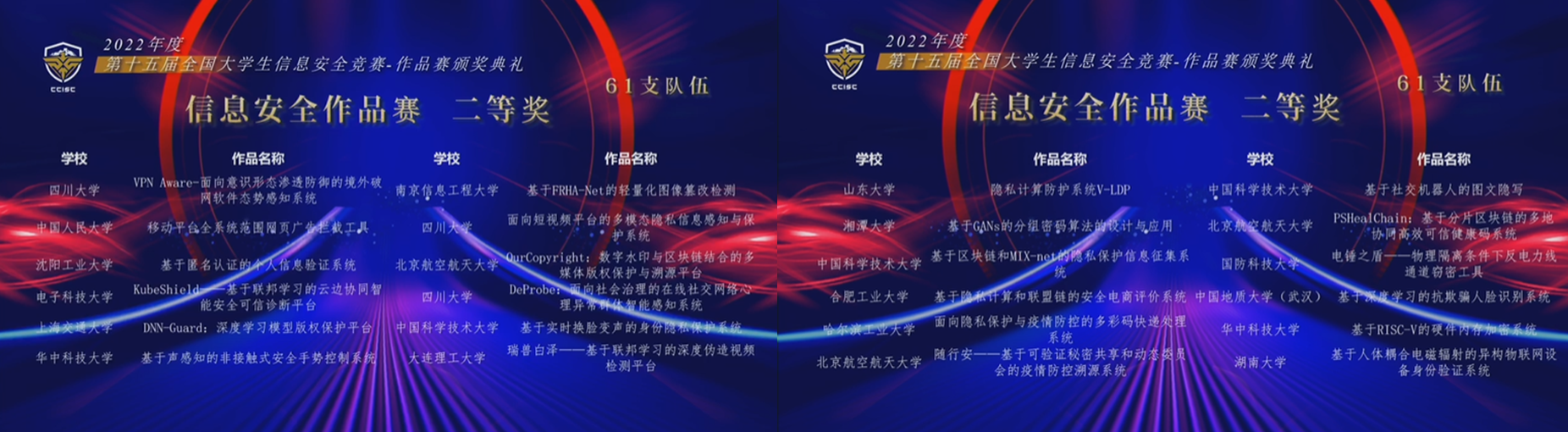 2022年8月22日,第十五届全国大学生信息安全竞赛—作品赛颁奖典礼在湖南长沙举行。pg游戏电子模拟器8支参赛队入围决赛,获一等奖5项,二等奖3项,最具创业价值奖2项。