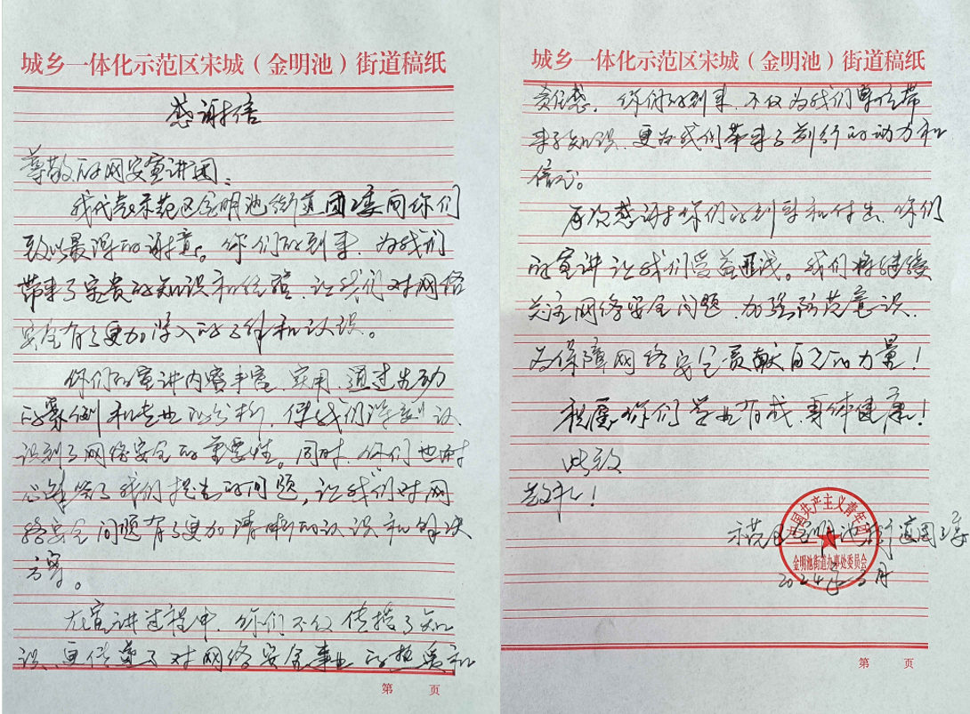 网络空间安全宣讲团与大学生“返家乡”活动相结合,让宣讲成员们将所学的网络安全知识带回家乡,为家乡的网络安全建设贡献自己的力量。通过线上线下相结合的方式,向当地居民普及网络安全知识,讲解网络诈骗的常见形式、识别方法和防范措施,有效的增强民众的网络防范意识并调高了自我保护的能力。