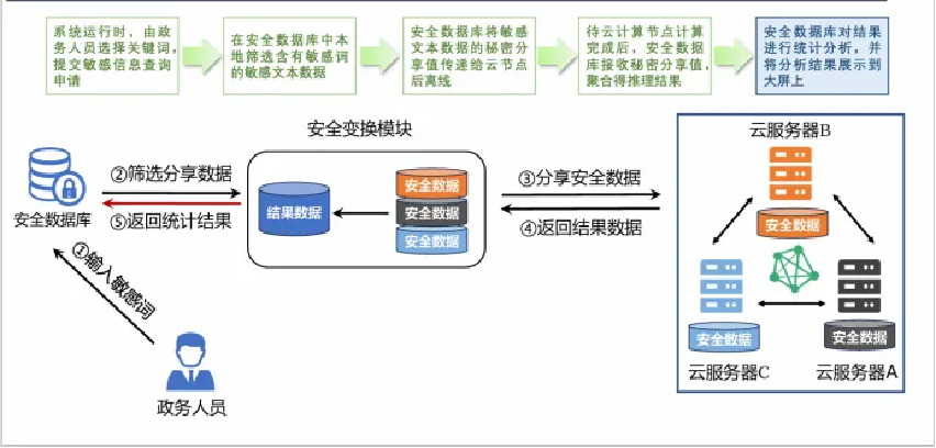 现有舆情监测系统需要使用者以明文形式传递监测内容,存在着一定的隐私泄露风险。本作品利用多方安全计算,使得用户输入的数据离开本地后以秘密分享的形式传递给大模型进行舆情分析,再将返回的推理结果进行聚合得到最终结果。为优化大模型在安全多方计算下的效率,本作品还提出了一种MPC友好的Transformer安全推理方案,在准确率相同时加速比超过这一领域目前最好的工作。