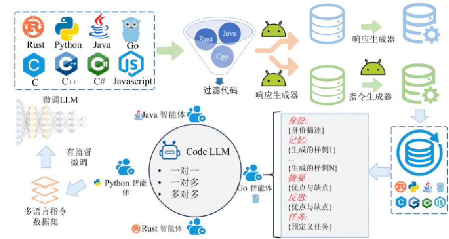 为了弥合不同代码语言之间的编程差异,本作品创新设计了一种多智能体协作框架,以增强Code LLM的多语言指令调优效果。该框架实现了多个具有生成记忆的特定语言智能体组件的协同工作,高效地将知识从一种语言传输到另一种语言。这些智能体致力于达成共同的任务,并通过信息共享来优化集体解决方案。此外,为了提升Code LLM的跨语言适应性,本作品基于开源数据构建了一个名为X-INSTRUCT的多语言指令数据集。本作品基于生成的数据集分别对Code LlamaDeepseek-Coder进行监督微调,进而生成Code LLM模型——xCoder,通过对xCoder进行测试,验证所提框架在代码理解与生成方面的有效性。