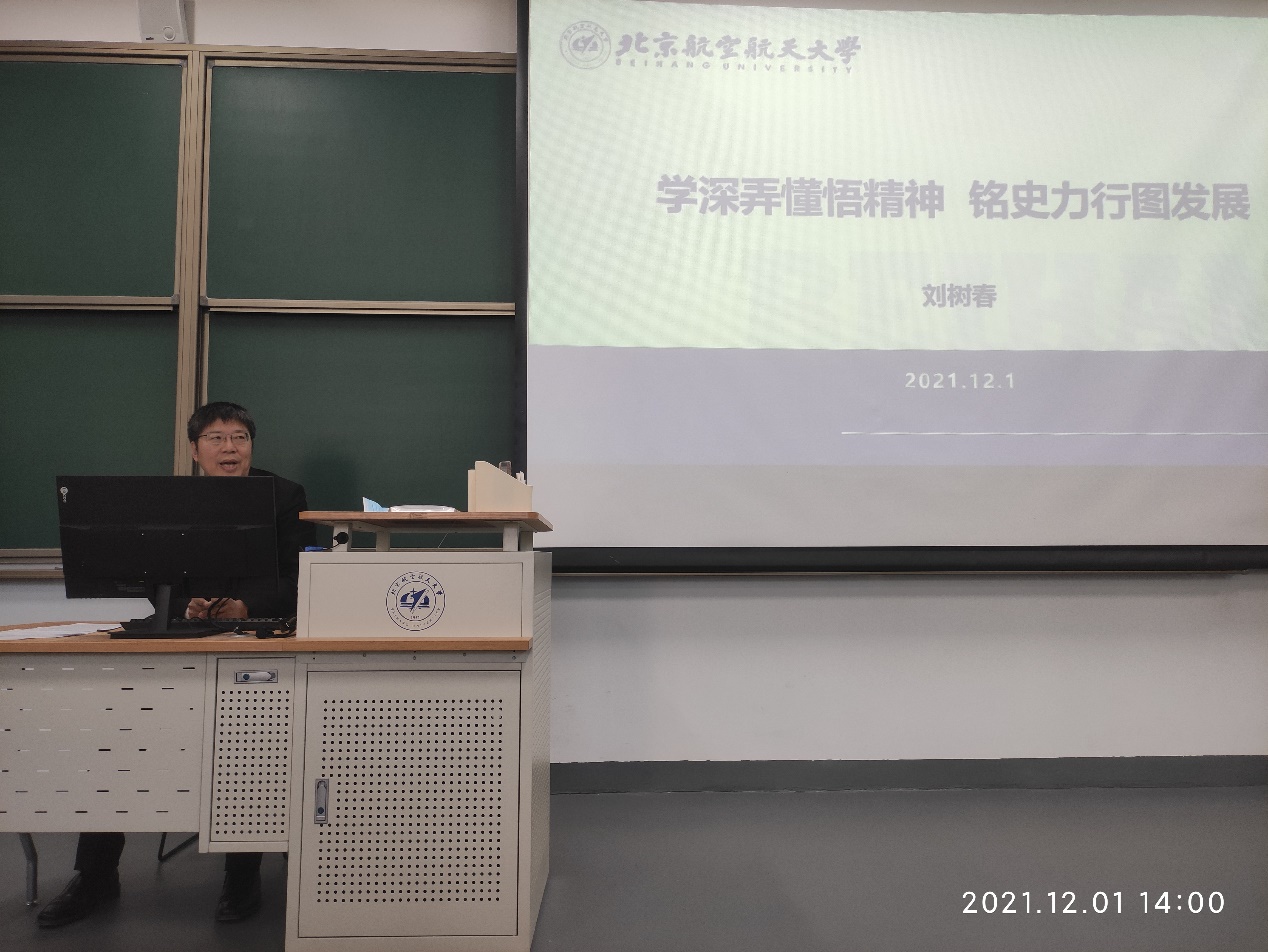 随后,刘树春副校长结合党史,重温北航光辉校史,介绍了北航“为国而生、与国同行”,建校以来,一代代北航人传承“空天报国”精神,为国家作出了突出贡献,优秀校友包括学术精英、兴业人才和治国栋梁,充分展现出“家国情怀、正直真诚、创新担当、实干有为”的精神特质。
