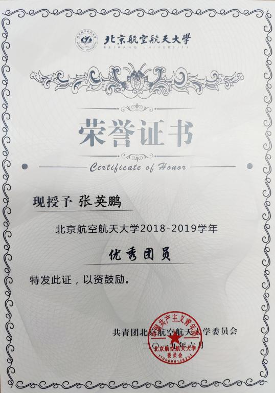 为加强我校共青团的基层组织建设,推动团支部职能化建设,围绕立德树人根本任务,激励基层团支部学习贯彻习近平新时代中国特色社会主义思想,以“四进”为手段,以“四信”为目标,切实学习和践行社会主义核心价值观,弘扬北航“四爱精神”,深入开展“青春心向党·建功新时代”教育实践,创先争优,激励和引导广大团员大力弘扬爱国主义精神,推动各级团组织工作水平的提高。校团委在全校开展2018—2019学年度校 “优秀团员”评选活动,我院优秀学生张英鹏、施继婷获2018—2019学年度校“优秀团员”,予以表彰。